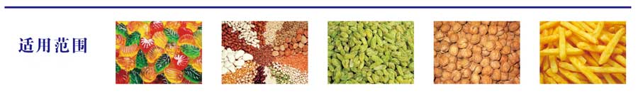 適合糖果、瓜子、果凍、冷凍、開心果、花生、果仁、杏仁、葡萄干等休閑食品;寵物食品;膨化食品;五金件、塑料膠料等各種顆粒狀、片狀、條狀、圓狀及不規(guī)則形狀等物料的定量稱重與包裝。