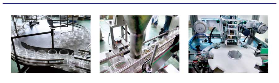 振動給料機、Z型輸送機、電腦組合秤、工作平臺、理瓶機、自動罐裝機、旋蓋機、成品輸送。