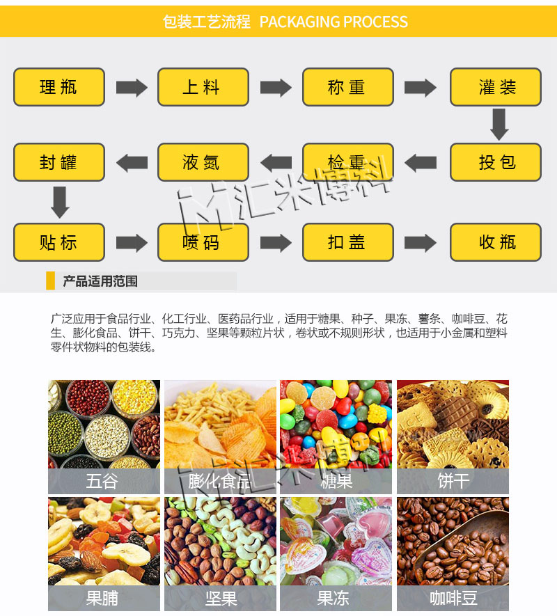 - 產(chǎn)品用途: 全自動五谷雜糧顆粒(塑料瓶金屬蓋)稱重包裝機生產(chǎn)線用于瓜子、花生、糖果、開心果、果仁、各類堅果、休閑食品、肉類等顆粒狀、片狀……