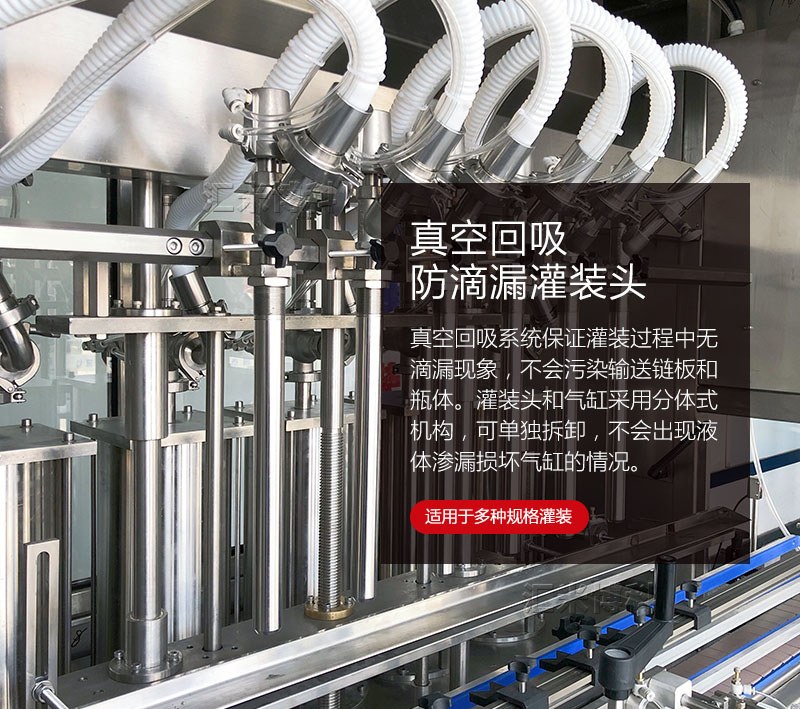 1、真空回吸系統(tǒng)保證灌裝過程中無滴漏的現(xiàn)象,并不會污染輸送鏈板和瓶身。灌裝頭和氣缸選用分體式機構(gòu),可單獨拆卸,并不會出現(xiàn)液體滲漏破壞氣缸的問題。進口亞德客氣缸堅固耐用,其它密封等零部件使用標(biāo)準(zhǔn)件,替換維護簡單便捷。